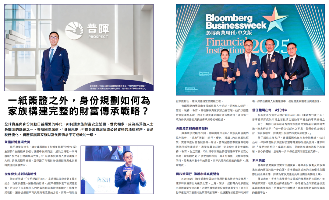此次《彭博商业周刊/中文版》对普晖国际行政总裁陈家轩先生及普晖国际的深度报道,为高净值家族阐述了「身份规划」在家族财富传承中的战略核心地位。
