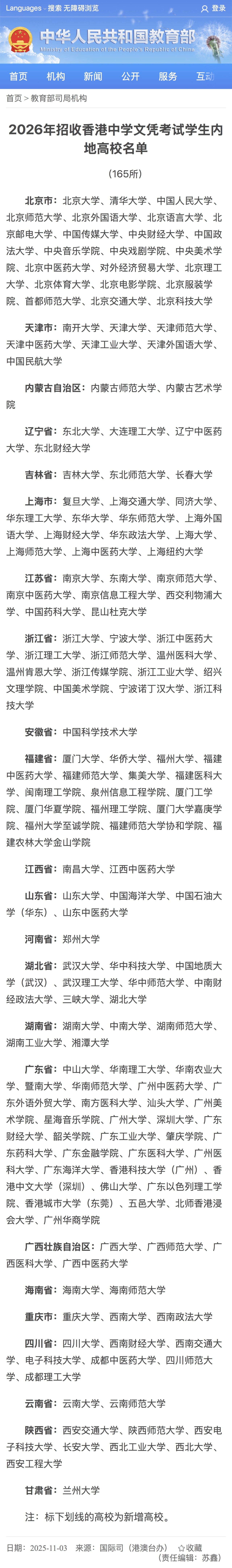近日,教育部正式公布了2026年内地高校招收香港中学文凭考试(HKDSE)学生的办法,最新名单显示可招收香港DSE学生的内地高校已增至165所,较去年新增20所,引发香港教育界和考生家庭广泛关注。