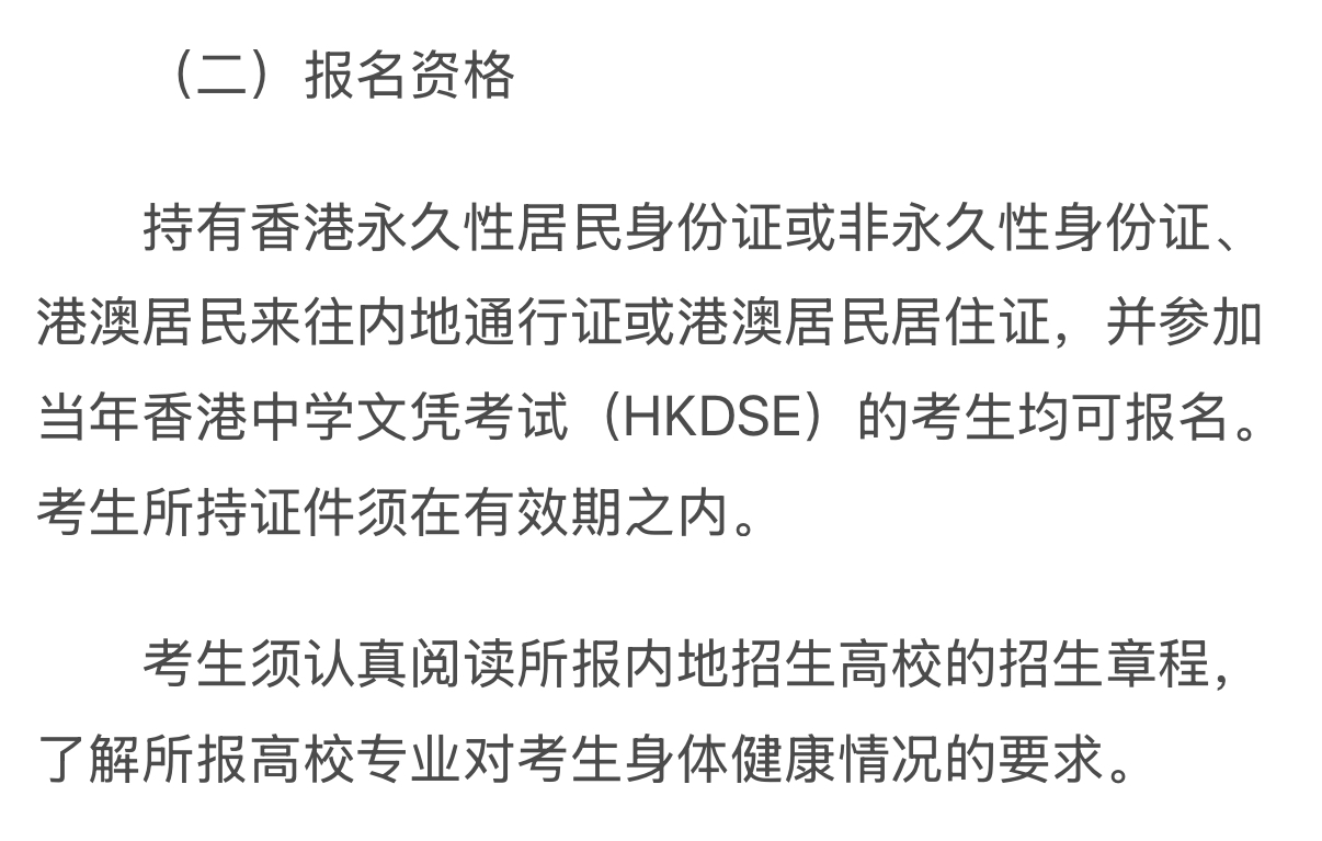 根据教育部规定,持有香港永久性居民身份证或非永久性身份证、港澳居民来往内地通行证或港澳居民居住证,并参加当年香港中学文凭考试(HKDSE)的考生均可报名。