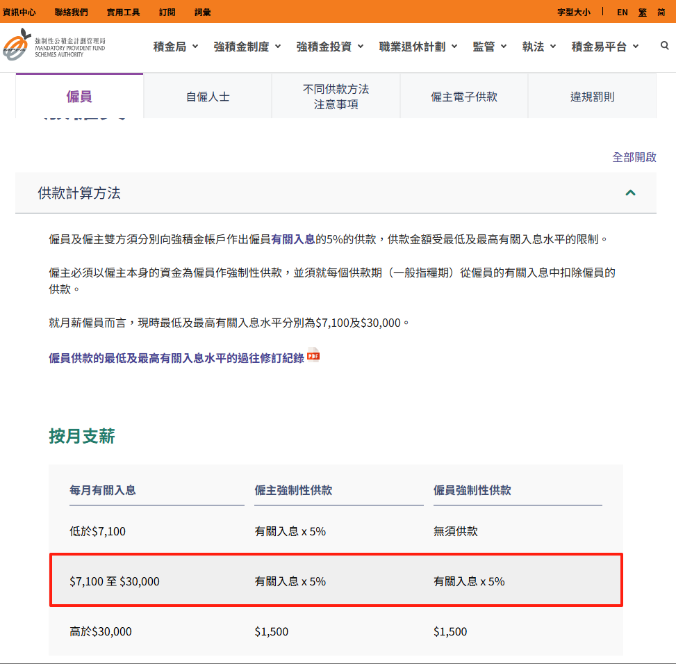 目前供款比例一般为雇员收入的5%,雇主与雇员各自承担,双方每月供款上限均为1500港元。举例来说,若月薪为3万港元,每月需供款1500港元;若月薪超过3万,超出部分不再额外计算供款。