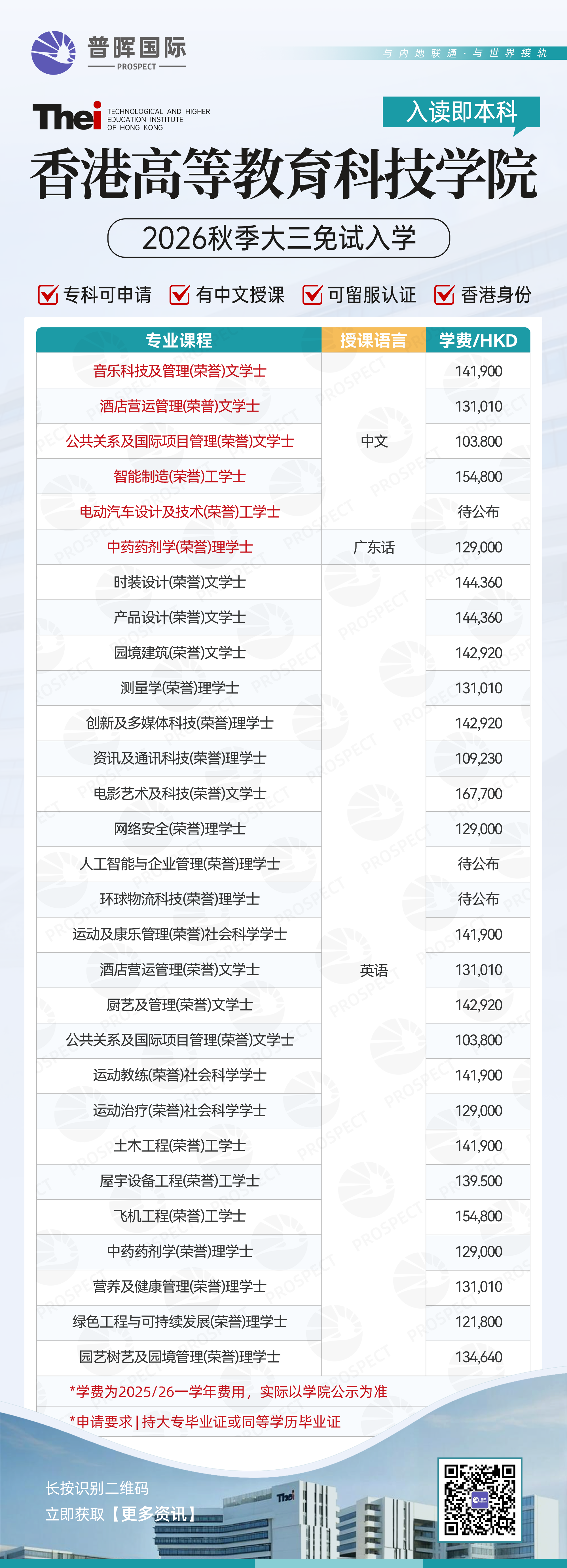 香港高科院(THEi)2026年秋季专升本招生现已启动!