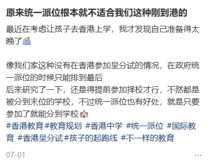 统一派位,是指学校在扣除重读生及自行分配学位的名额后,将剩余学位进行的统一分配。其中约10%的名额不受校网限制,其余约90%则按学校所属的网络进行分配。统一派位这个环节是按学生的派位组别、家长选校意愿和随机编号分配中一学位,也被香港家长们称为“大抽奖”。值得注意的是,统一派位需要提供孩子小五小六的呈分试成绩,从内地转学来香港就读中一的学生由于没有呈分试成绩,因此就算参加了统一派位,也需要等本港小学生分配完中一学位之后才会轮到。继续往下看,小编给您分析。