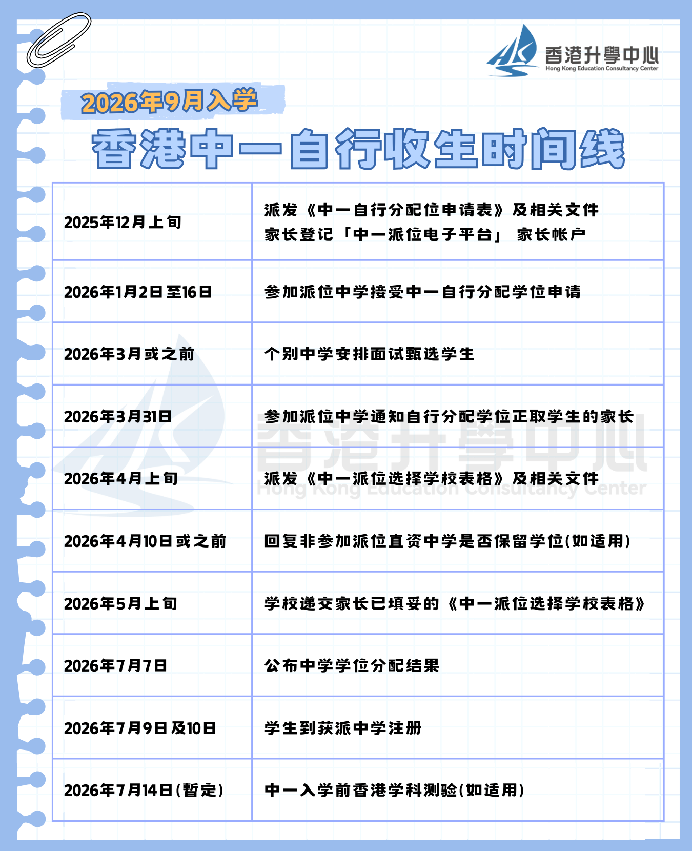 看到这里,是不是对香港中一学生入学流程有一定的了解啦?以上分享经验和注意事项,都是我们升学中心的老师多年实操积累下来的。对内地来港升读中一的学生而言,自行分配学位是继申请直资中学阶段后最主动、最重要的机会,务必把握关键时间节点。每年的这个时候,家长和学生们是最容易手忙脚乱的。如果您依旧在为孩子升中而苦恼,或者不熟悉香港中一派位机制,欢迎后台联系我们~HKECC香港升学中心同时也为大家整理了中一自行分配学位2026年9月入学的申请时间线,供各位家长参考: