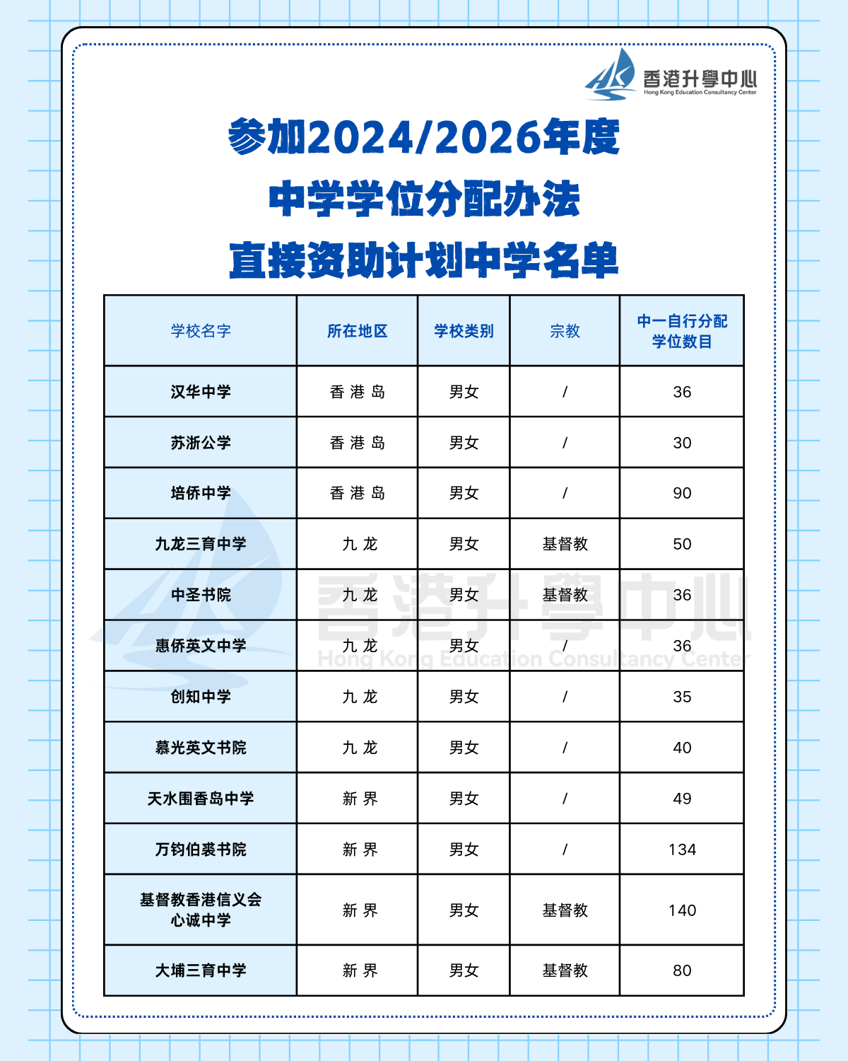 而对于内地来港就读中一的学生家长来说,保守且稳健的择校策略往往能让孩子找到合适自己水平的理想学校,香港参加2024/2026年度中学学位分配办法的官立、资助及按位津贴中学共有383家,对于内地来港升学孩子来说,直资中学是比较容易“上岸”的学校。以下是HKECC香港升学中心整理出来参与香港中一自行分配学位的12家直资中学,供家长们参考~