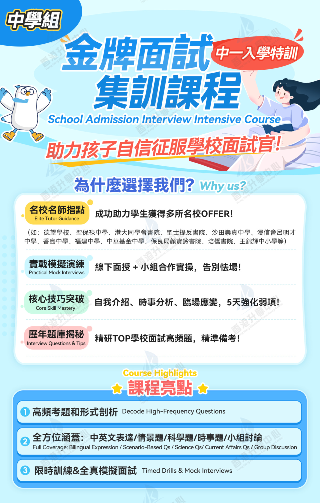 HKECC香港升学中心提供从面试到适应香港学习内容的一站式服务,不少孩子从HKECC香港升学中心有趣的夏、冬令营开始接触香港生活、面试的技巧,再过渡到我们的面试班以及脱产托管班,最终斩获梦校Offer,机会总是留给做好准备的人哦!距离2026年自行分配学位面试仅剩数月,正是最后冲刺的关键期。有意向的家长请即刻为孩子预约HKECC面试班专业评估,开启系统训练,稳握梦校入场券!