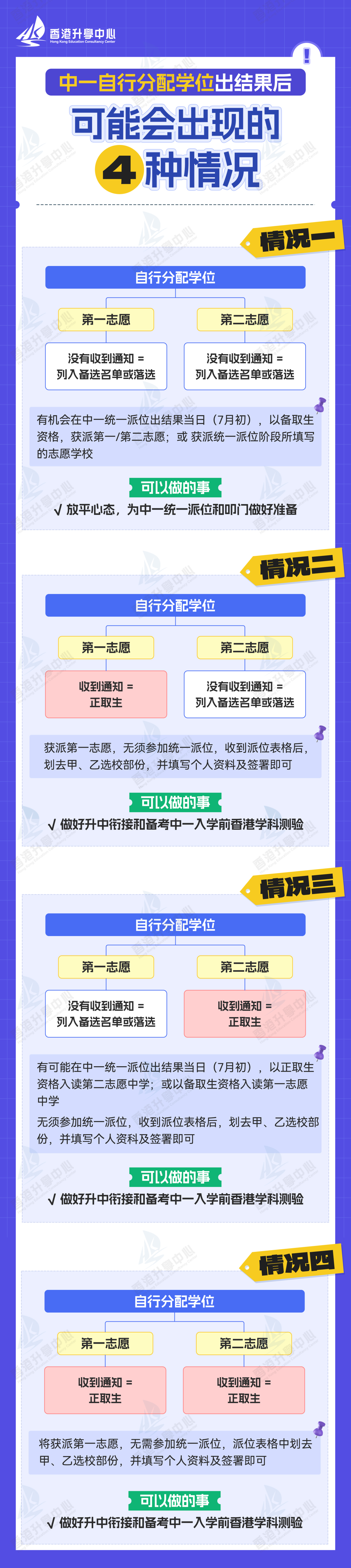 在申请的过程中,如果孩子能在中一自行分配学位的申请阶段就拿到心仪中学的Offer固然是大家都希望的好结果,但申请过程中往往会出现以下四种情况