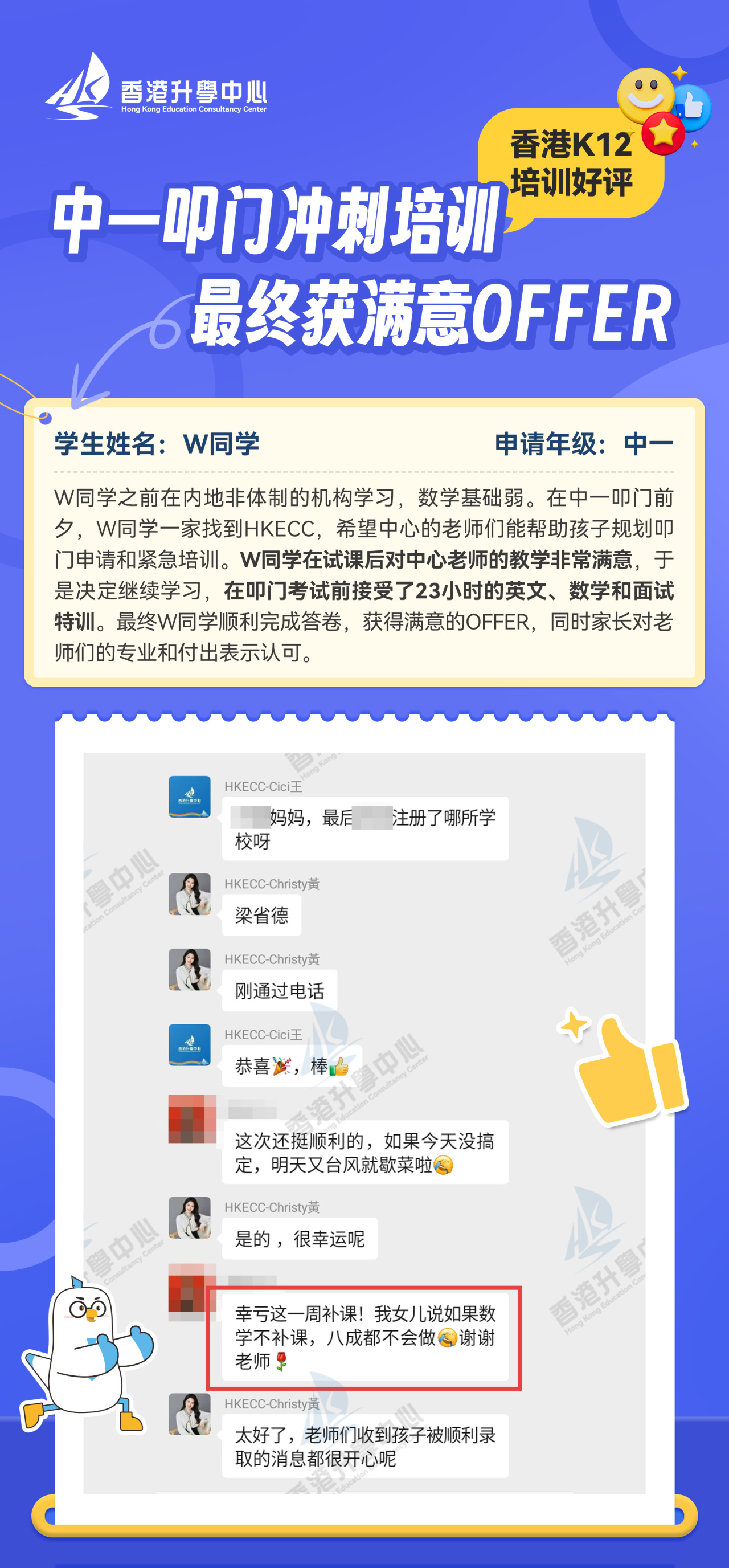 如果在中一自行分配学位的时候没有获得理想的结果,只能去叩门的话也不用担心,HKECC香港升学中心用两个简单的案例告诉大家,只要找到用心的机构根据孩子的情况精心准备,也是有可能在叩门阶段取得理想offer的哦!在以下案例中,W同学于叩门前冲刺了23小时的特训,最终成功拿到了理想Offer~