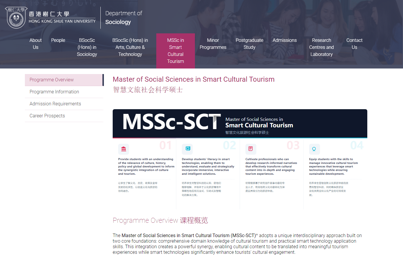 智慧文旅社会科学硕士(MSSc-SCT)课程*采用独特的跨学科模式,建立在两大核心基石之上:全面的文化旅游领域知识与实用的智慧技术应用技能。这种融合创造了强大的协同效应,不仅能将文化内容转化为富有意义的旅游体验,更通过智慧科技显著提升游客的文化参与度。