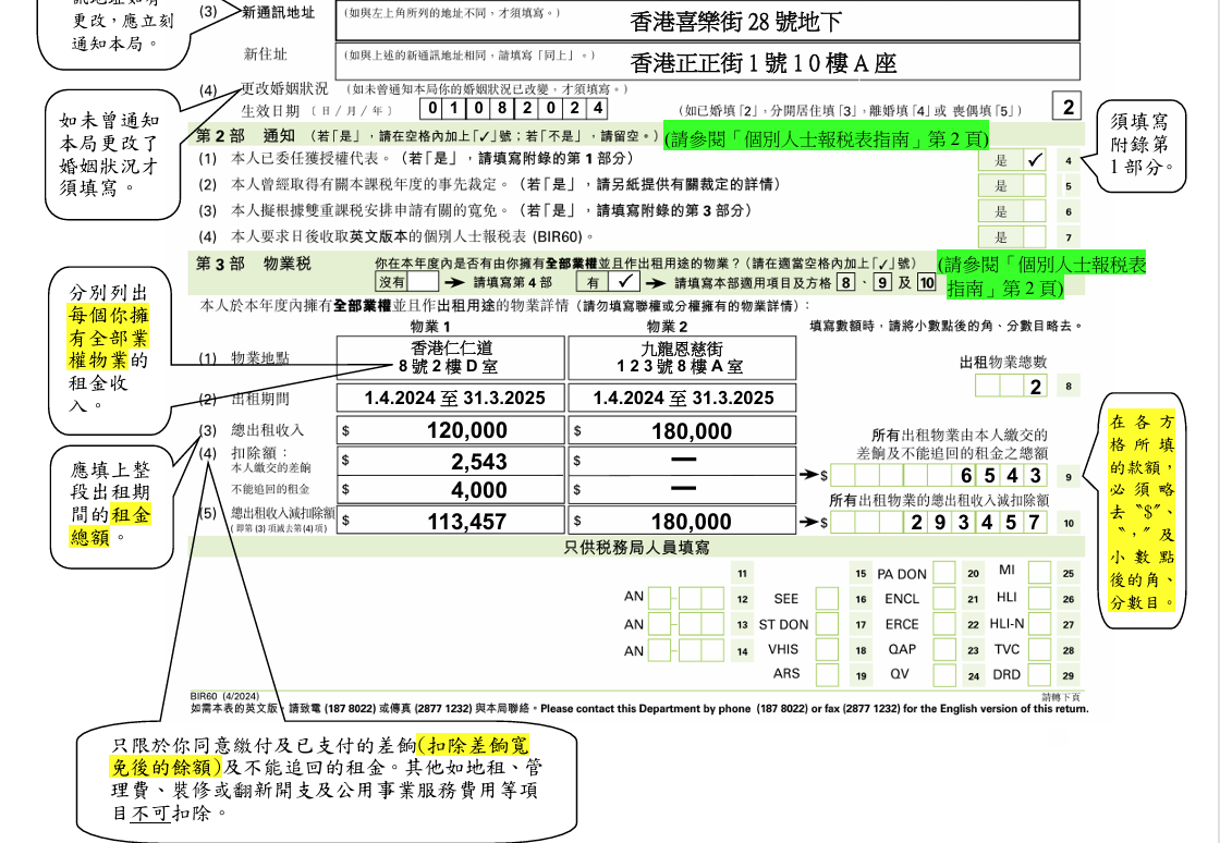 报税表要填写个人资料、物业税、薪俸税,以及在本年度内所获得的入息等信息。公司一般在4月至5月向员工发放“课税年度收入报表”,可据此填写收入金额。