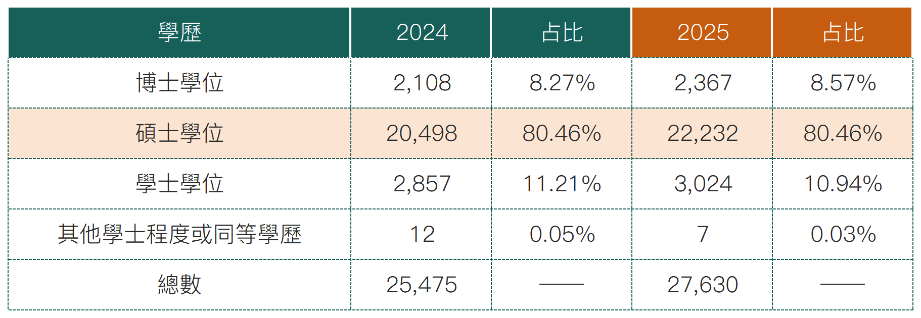 硕士毕业生是绝对主力:占比高达80%。一年制授课型硕士因时间成本低、无需统考、性价比高,成为内地人士获取香港身份的优选路径。