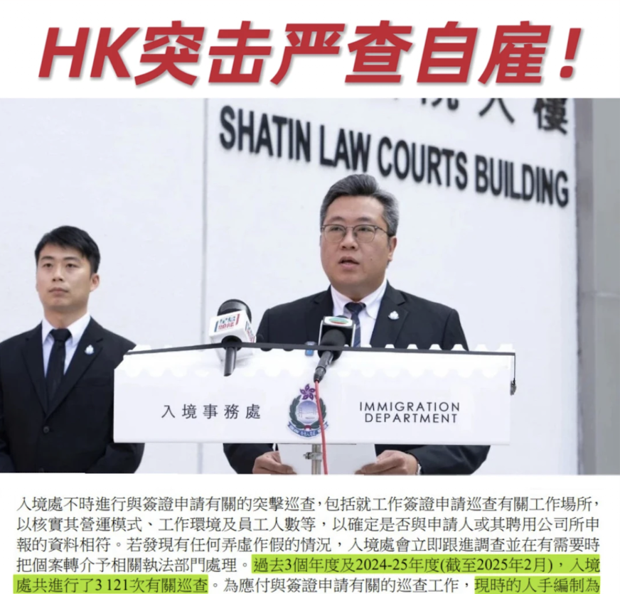 截至2025年2月,入境处已完成3,121次实地突击巡查。同一时期,因雇佣关系造假导致续签被拒、签证被撤销、被列入黑名单的案例数量,较上年同期增长超过200%。