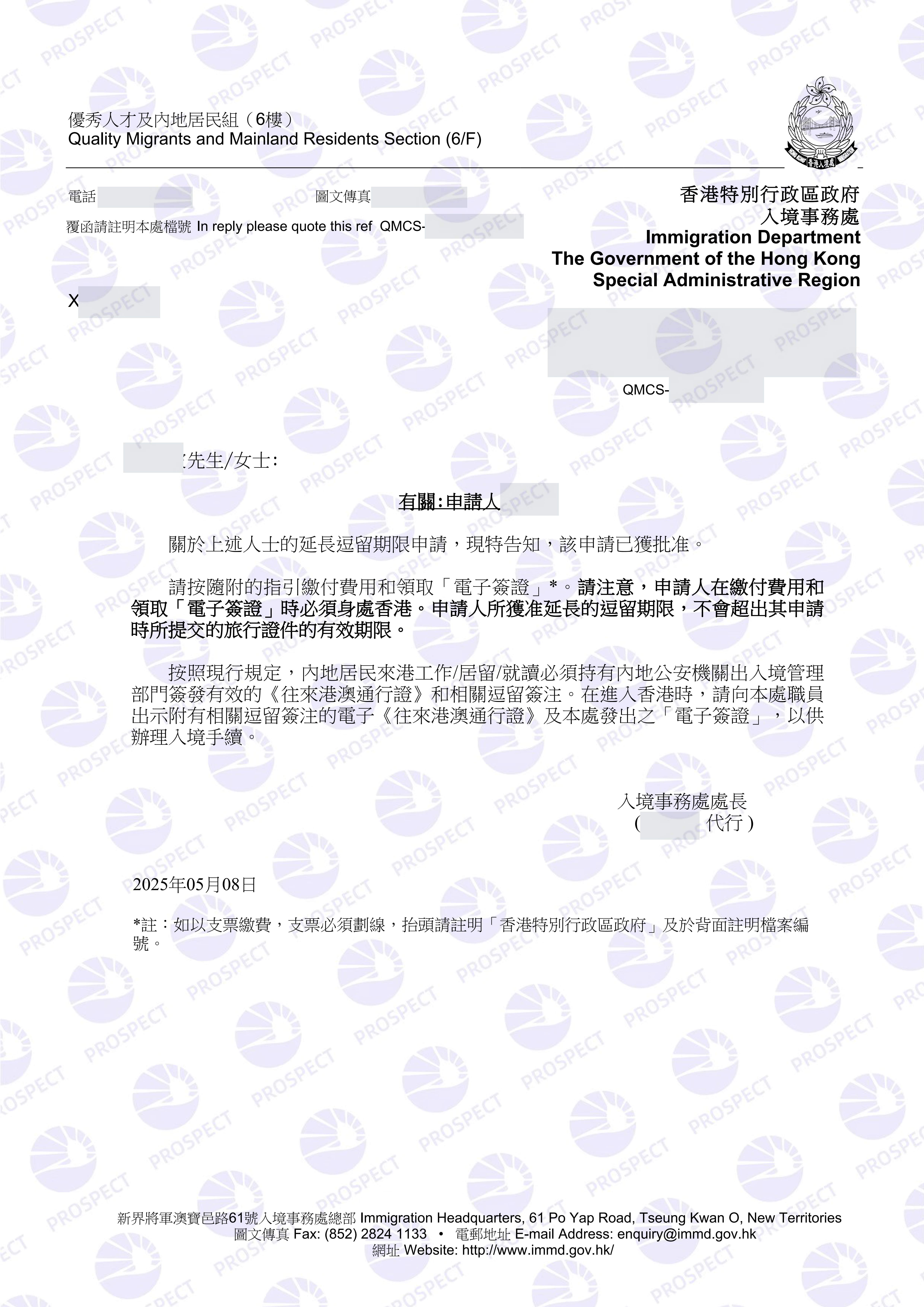 普晖团队从客观工作安排冲突角度说明情况,并附上入境处邮件的接收记录以证明非故意忽略。材料整理完毕后,协助申请人通过网上系统递交续签申请并持续跟进进度。约三周后,申请人收到入境处的续签获批函,受养人身份同时恢复。