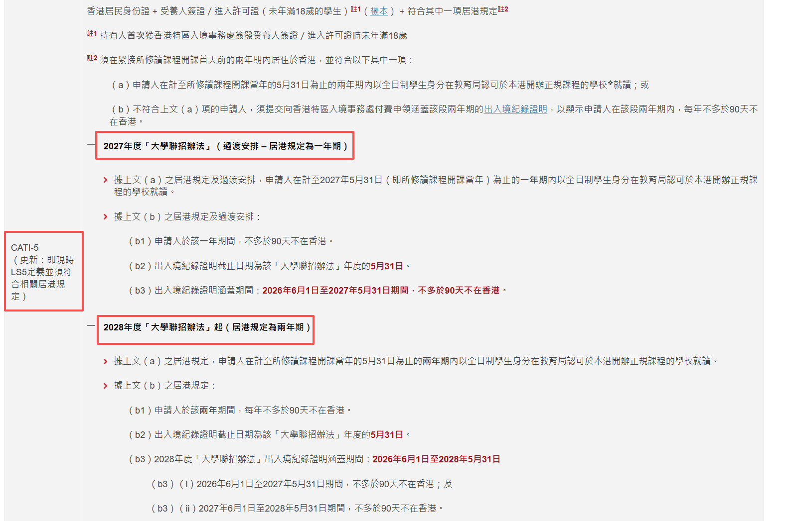 根据JUPAS公布的最新要求,受养人子女须同时满足“就读香港课程”与“在港居住时限”两项条件,方可维持JUPAS本地生申请资格。具体执行时间表如下: